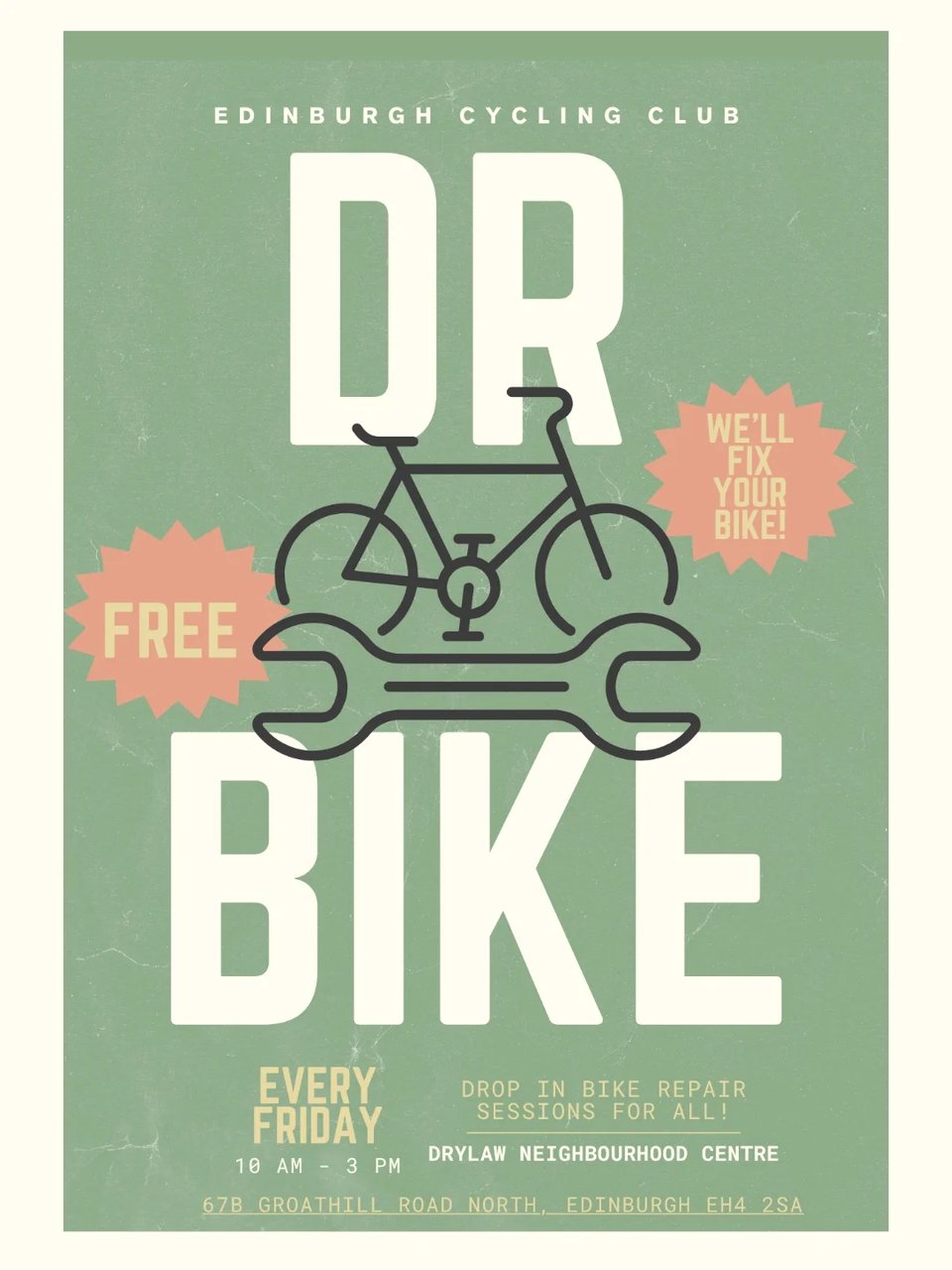 🪛 Weekly Dr Bike cycle repairs from ELREC’s Edinburgh Cycling Club, 10am-3pm at the 📍 Drylaw Neighbourhood Centre - no booking required and all welcome;