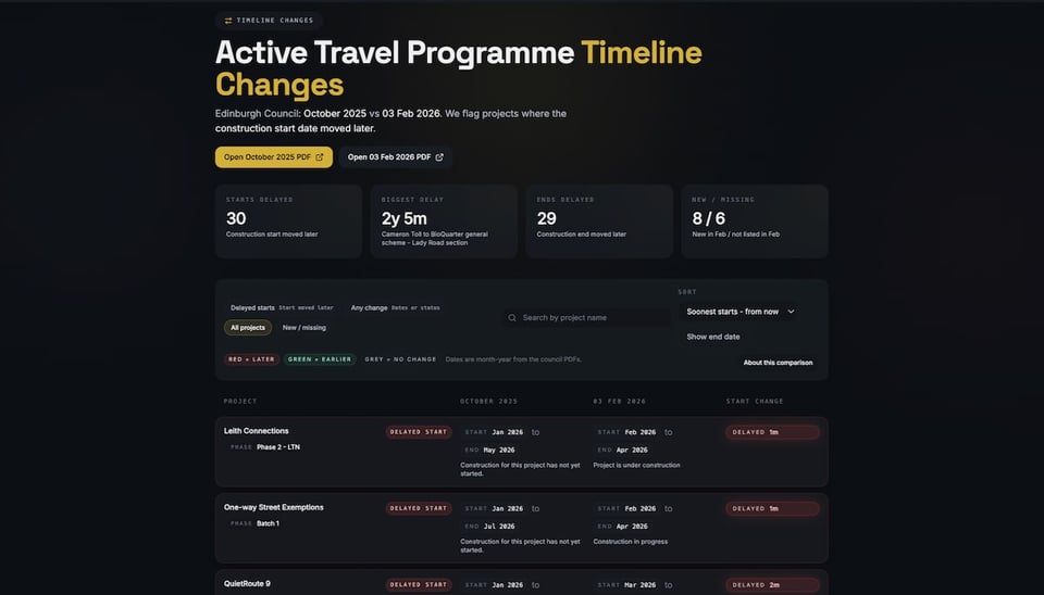 With the publication of an update to the City of Edinburgh Council’s Active Travel Improvements Programme [PDF], local hero and friend of the digest Harry Williams pulled together an online dashboard summarising the projects and their respective delays — because yes, many are delayed again, even further.