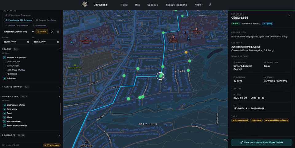 Harry Williams at City Scope has been slurping up all of Edinburgh’s data again, this time festooning a map with all of the ‘active travel’ related roadworks, route plans (new, consulted on and newly permanent) and created Cycle Scope, an online map-based exploration tool. Worth a look especially on a nice big screen - have a read of our dive into it below, teasing out what some of the different layers and filters can be useful for (there’s a lot to see!).