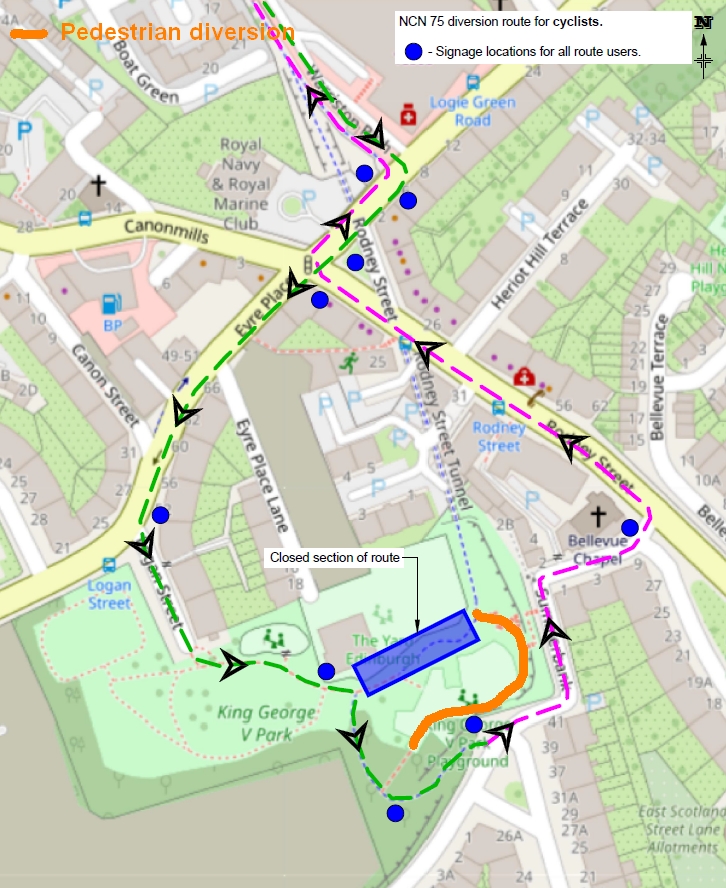 [The closure is] poorly signed with no cycle diversions despite being part of National Cycle Route 75. The "pedestrian" diversion is through a play park and up a steep ramp and not very welcoming to cargo bikes and I suspect they wouldn't want anybody cycling through there. Also some gates to contend with. The only closures signs will probably just be at the location rather than at the places where cyclists could choose an alternative route and the current notices are inconspicuous