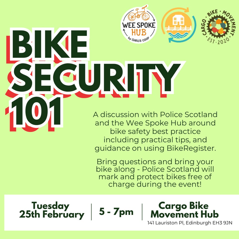 We will have speakers who will discuss good practice with bike security, and Police Scotland are bringing along kit to mark and protect your bike and provide guidance on using BikeRegister. Bike locks will be available on sale with a discount code. Come along with your bike to mark and protect, and with any questions for our presenters.