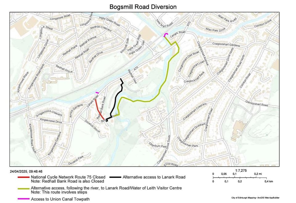 🏗️ Colinton Dell: NCR 75 link between Water of Leith and Union Canal over Lanark Rd, closed all this week (28th April) for a crane lift. Two diversions are provided on narrow adjacent paths, which may require dismounting.