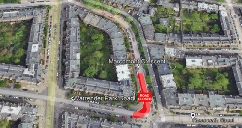 🕳️ Marchmont Crescent: closed at the modal filter by Warrender Park Rd and Roseneath St for Scottish Water manhole repairs. The Leamington Walk shared path around the Meadows may provide an alternate route east-west.