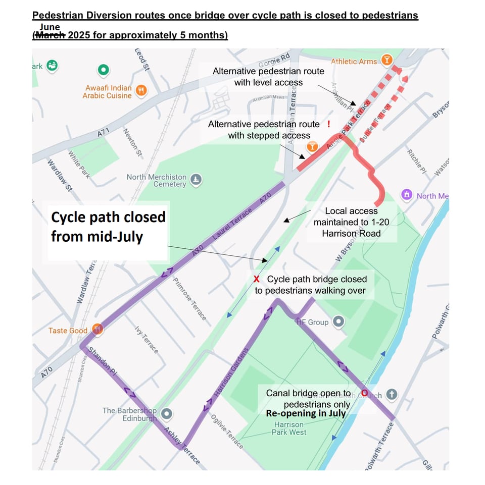 🚧 Murieston Crescent, Dalry: Closed at Dalry Road next week 23rd to 29th June for BT repairs. If you’re travelling between Slateford and Roseburn Path, the new Dalry Park may offer an alternative.