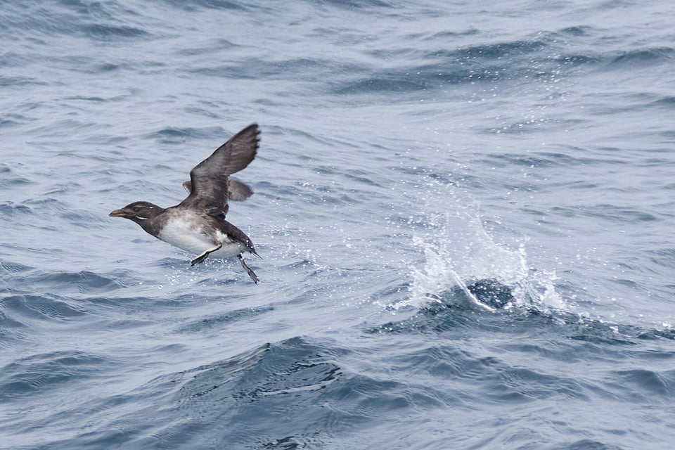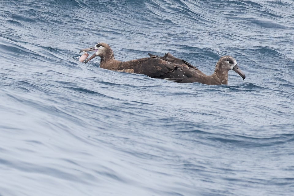 All hell breaks loose. Over the next half hour, every animal in the Pacific apparently decides to show up. The bow becomes a heaving mess of binoculars and telephoto lenses. At one point, at least four spotters point in different directions and shout the names of species that I have never seen before. Storm-petrels and phalaropes fly by. Adorable Cassin’s auklets float in the water before taking off in comical fashion. Two Laysan albatrosses—a formerly rare species that’s usually seen one at a time—sit in the water together, pecking at a mola-mola and showing off some expertly applied smoky eye. Northern right whale dolphins—a curious cetacean without a fin on its back—leap in the distance. Pacific white-sided dolphins surf next to the boat.