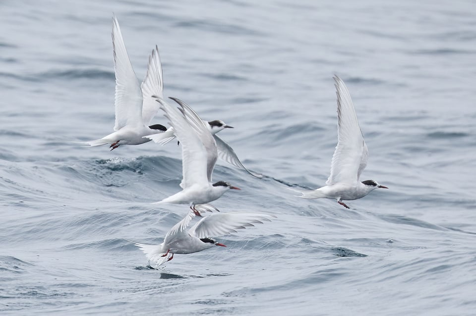 Every year, Arctic terns shuttle back and forth between the poles, chasing the longest days of each hemisphere in the longest migrations of any animal. In September, they’re starting to head south, and our paths cross with theirs 7 hours into the trip. Dozens of terns wheel overhead on long, elegant wings, before transforming into harpoons as they plunge into the water for fish. As they emerge, they’re pursued by jaegers—powerful, piratical seabirds that harass the terns into dropping their hard-earned catches. The gathered birders whoop and cheer as the dogfighting birds pull off unbelievable aerobatics. One jaeger corkscrews vertically, flips over, and briefly flies upside-down as it chases a tern. Another gets chased by a tern, who has apparently terned the tables.