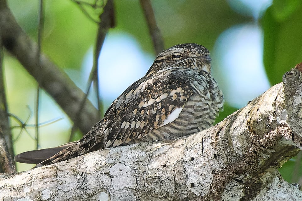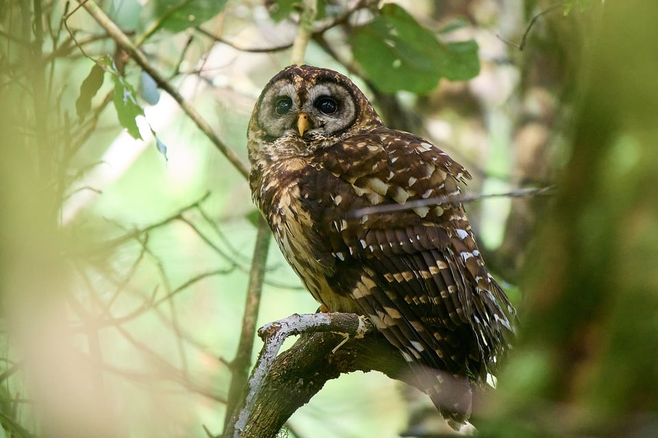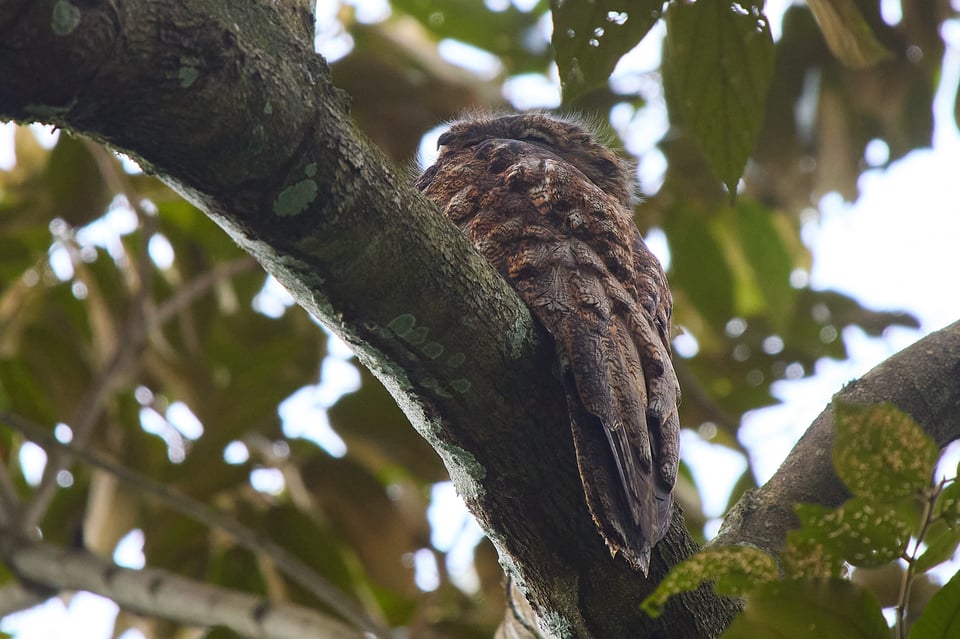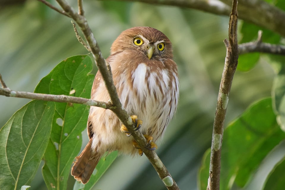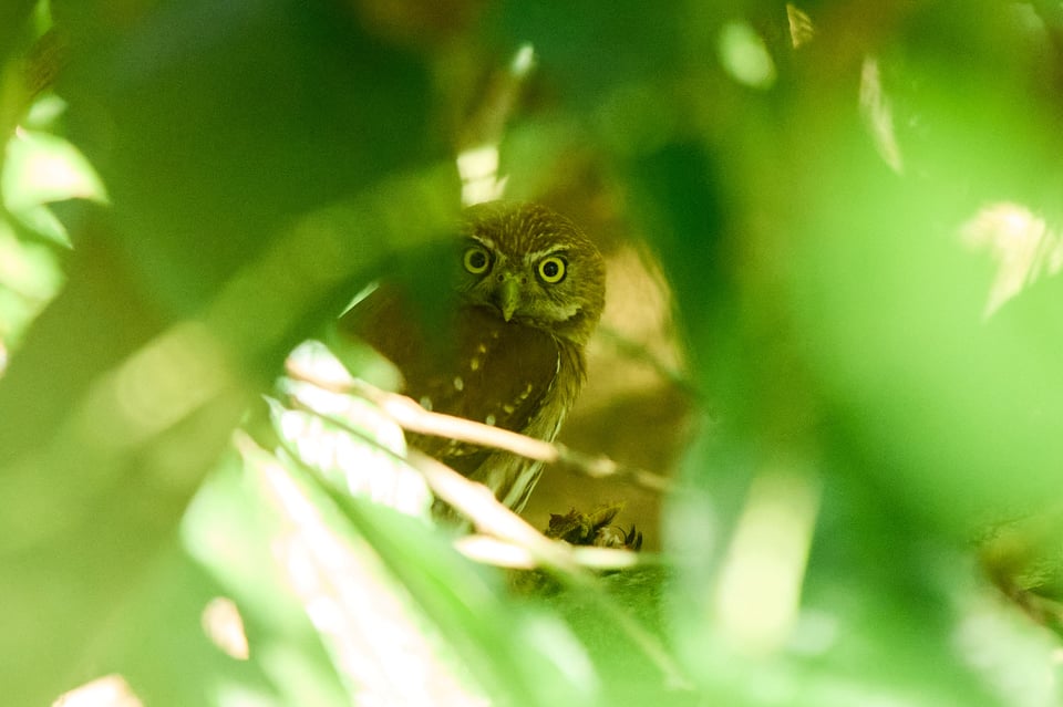 That explains why the warblers are losing their mind. It also explains why we quickly follow suit. Owls are so special that finding one has an immediate magnetic effect. Our attention is instantly pulled away from whatever it was we were previously watching and towards the… towards the… wait, where are we meant to be looking? Even when our guide, Isis Castro, spots the owl and shines her laser pointer to the left of its position, I still can’t see anything bird-shaped. Words prove agonizingly unhelpful, as people gamely try to describe a specific constellation of branches and leaves in scene that consists entirely of branches and leaves. But then, I shift position by a few inches, and I find exactly the right window through several layers of foliage, and I finally see a tiny ball of rust-tinted feathers tearing away at an even tinier ball of feathers. And through that same narrow portal of greenery, a ferruginous pygmy-owl looks up and stares right at me.