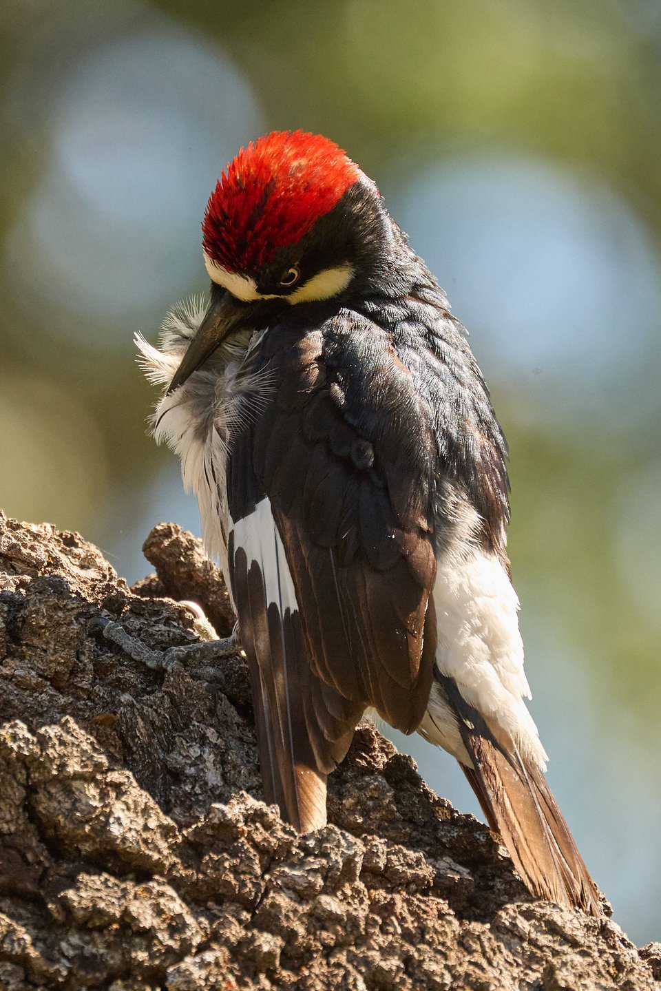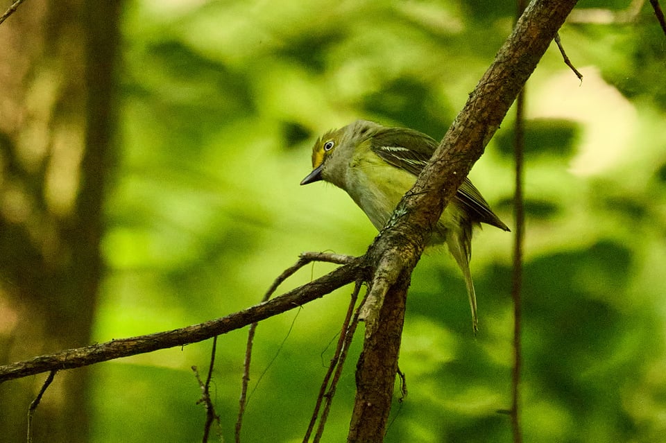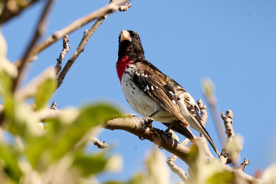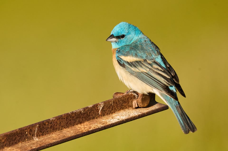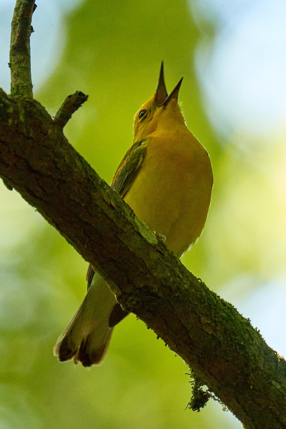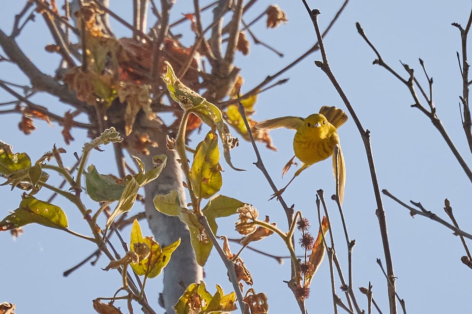 Here’s a western tanager taking off. You’re looking at its butt, and its wings are folded up above its body.
