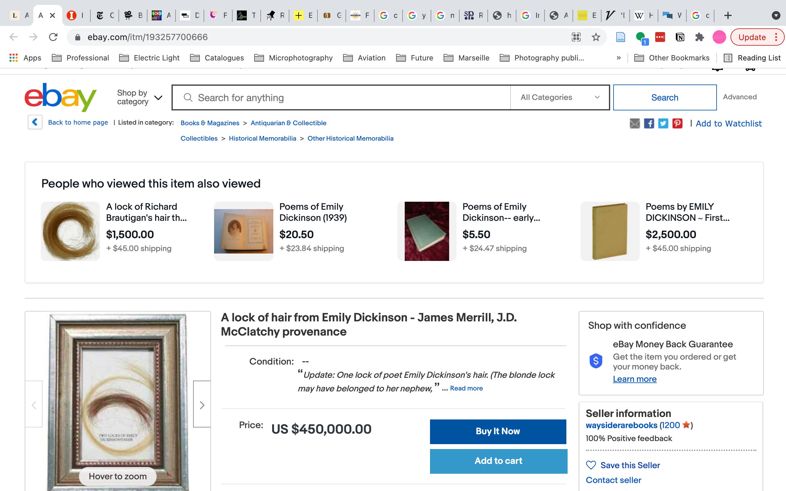 A lock of what is supposedly Emily Dickinson’s hair is currently for sale on eBay, the result of a weird story investigated by Jen DeGregorio for LitHub. The winding tale of this lock of hair raises as many questions as it answers, interrogating literary legacy, historical stewardship, fame and profit, and historical authenticity, among other concerns. The TV show Dickinson, created by Alena Smith, prompts much the same set of questions.1 Drawing on historical media to conjure an aura of authenticity, the show opens with a series of reproductions of nineteenth-century photographs overlaid with the clicking whirr of a slide projector. The opening narration uses the photographs to illustrate what is “known” about Emily Dickinson, reiterating one of the most widely repeated points of Dickinson’s biography: that her work was relatively unknown during her lifetime. But what does it mean to be “known”?