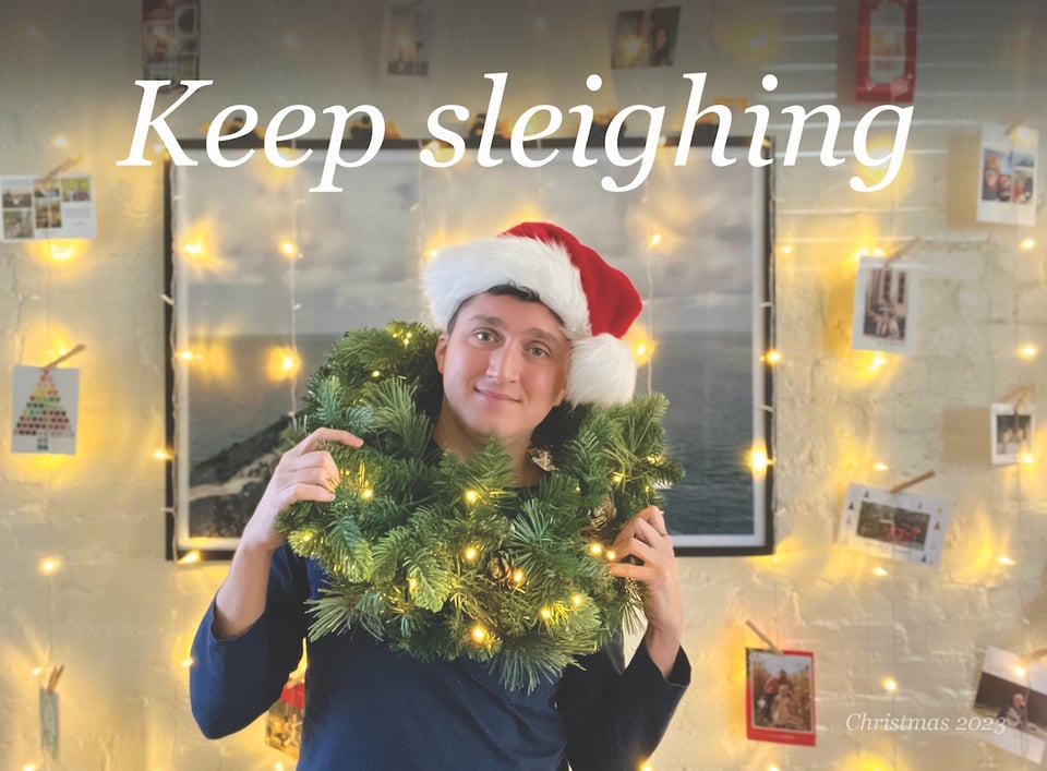 For 15 years I’ve been sending custom Christmas cards to friends and family (if you’d like to receive one, send me your mailing address). Two years ago I switched from wintery landscapes to solo photos of me in festive attire.