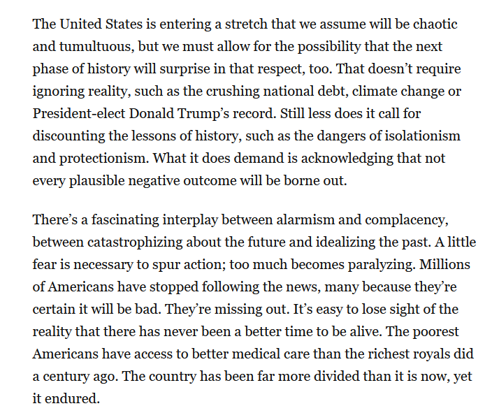 There’s a fascinating interplay between alarmism and complacency, between catastrophizing about the future and idealizing the past,” wrote the Post. “A little fear is necessary to spur action; too much becomes paralyzing. […] It’s easy to lose sight of the reality that there has never been a better time to be alive. The poorest Americans have access to better medical care than the richest royals did a century ago.”