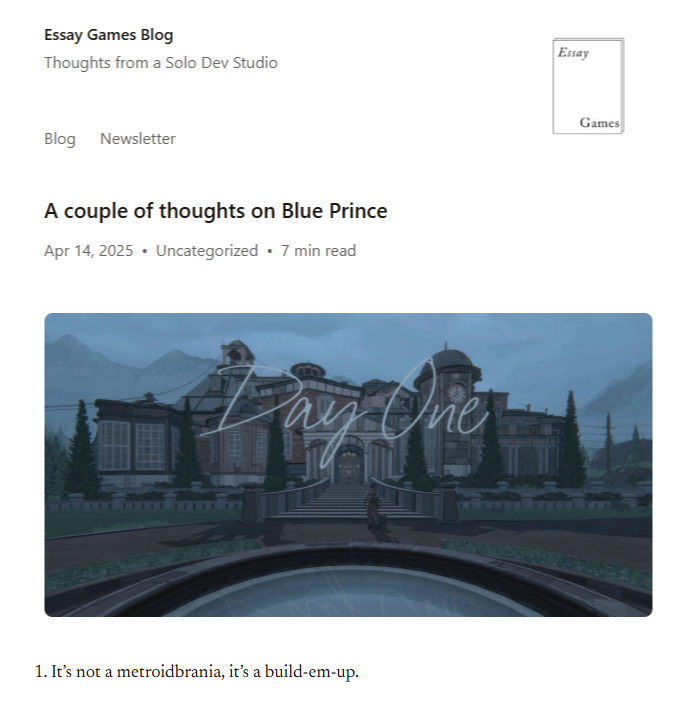 Inspired by other game devs and artists, I’ve restarted a weekly blog. In the first couple of weeks, I wrote about Blue Prince, Chants of Sennaar, and my first postmortem piece about Bundle of Joy in response to calls for “making small” or “personal” games. It’s been fun getting back into weekly posting and motivating myself to write about what I’m playing, reading, seeing, and contemplating.