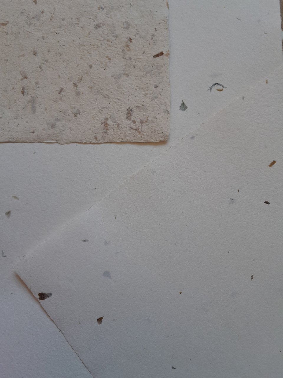 Et pour conclure cette petite (mais déjà trop longue) lettre, je te propose de lancer Le jeu du papier plié avec tout simplement dans chaque missive un exemple de papier, de reliure ou de façonnage qu’on aime bien ! Je commence donc avec ce très joli papier à inclusion de végetaux produit par le moulin du Got à Saint Léonard de Noblat dans la Haute Vienne !