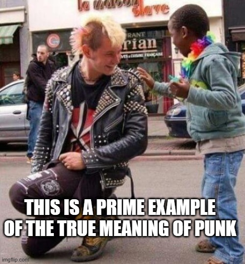 Tu le sais et les gens qui nous lisent aussi peut-être, je lance la semaine prochaine le financement participatif de 3 petits jeux de rôle que j’ai qualifiés de « punk ». Je ne dis pas ça pour faire ma pub (OK, un peu quand même) mais parce qu’en conséquence, je suis allé causer dans pas mal de micros ces derniers temps, et la question de ma punkitude personnelle, et de celle de ces jeux, a surgi plus d’une fois. Parce qu’avec mon pull à rayures, ma gueule de cishet blanc CSP+ valide et j’en passe, on peut pas dire que je ressemble à la caricature du punk ; et d’ailleurs demander de l’argent aux gens plutôt que photocopier son fanzine comme un dégueulasse au boulot, c’est pas très punk, hmm ?
