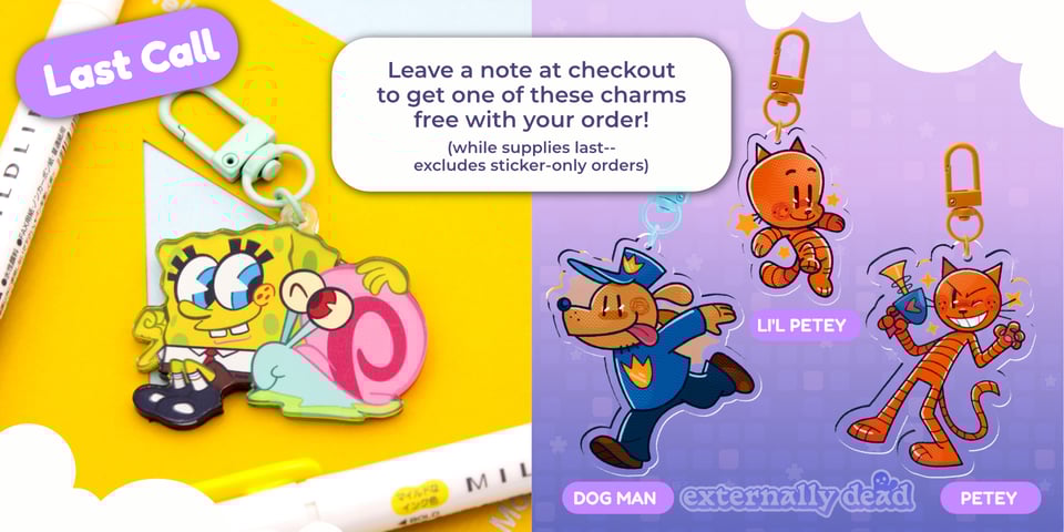 Unfortunately, I’ve encountered some trouble with a few of my listings! I won’t be able to sell Dog Man or Spongebob keychains anymore, due to copyright disputes. BUT I still have a few left! If you or someone you know wants any of the Dog Man Trio or Spongebob and Gary keychains, let me know in an order note and I’ll include one with your order* (for free!!)