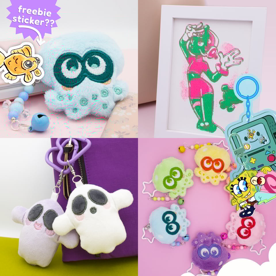 This month I have a few new spooooky offerings for you all. During the summer I decided to focus on creating more with my hands, and (a little) less with my drawings apps. I was in a bad funk and I needed a total reset! (and yknow… gestures vaguely at US government) For this update, I bring you some handcrafted plush keychains, and a screen print! Plus, some older stock is back up and available again, including a few leftover Coraline Stickers.