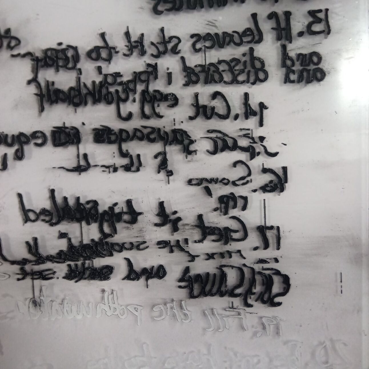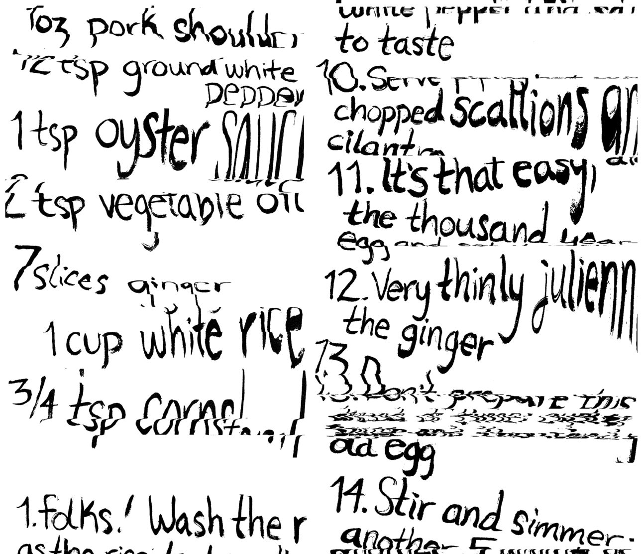 Recipes for juuk, char siu, and joong were run through a custom Python script, randomizing the ingredient measurements and instruction order to create a copy, reminiscent of the dish, but nonsensical. The new recipe was then written by hand with traditional calligraphy tools, digitally scanned with physical distortion, cut into acrylic, and then handpainted once again.