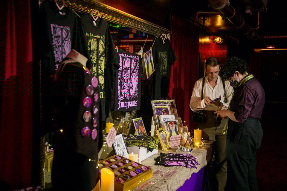 We still have some Fancypants merchandise available for sale– exclusively at the shows! Custom silkscreened t-shirts by our beloved co-creators at The Spooky Haus, as well as adorable buttons of our six core cast members, photographed lovingly by Kayleigh Shawn!