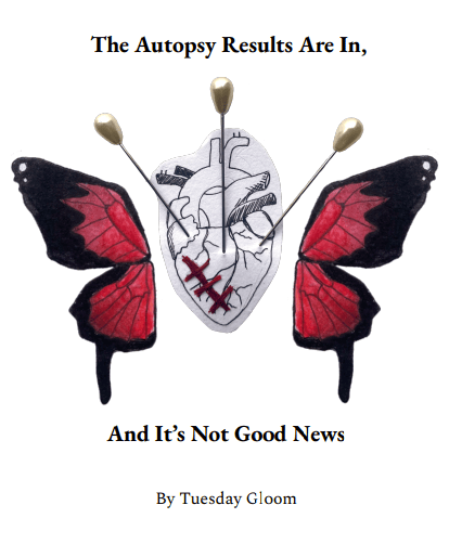 We’re also very pleased to announce that we have a new literary offering gracing the merch table: A new book of poetry by our own dear Tuesday Gloom, entitled “The Autopsy Results Are In, And It’s Not Good News.” This glorious slim volume is both hilarious and heartbreaking, profound and playful, evoking both the goddess and the godless. Pick up your copy and prepare to be blown away.