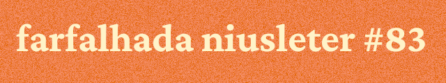 farfalhada niusleter é o meio mais livre e satisfatório por onde espalho, na internet, meus escritos fragmentários de muitos temas e tons: dos arranhões filosóficos e políticos baseados, quase sempre, no debate sobre civilização e ecologia, aos meus haicais, haibuns e zuihitsus da vida cotidiana. Alguns dos textos que compartilho aqui estão presentes no meu último livro, um miscelânea fragmentária chamada Retalhos. Atrair inscritos é sempre uma alegria, mas dá trabalho. Se você acompanha e aprecia esta niusleter, e conhece gente que também faria o mesmo, compartilhe, indique.