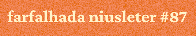 A farfalhada niusleter é o meio mais livre e satisfatório por onde espalho, na internet, meus escritos fragmentários de muitos temas e tons: dos arranhões filosóficos e políticos baseados, quase sempre, no debate sobre civilização e ecologia, aos meus haicais, haibuns e zuihitsus da vida cotidiana. Alguns dos textos que compartilho aqui estão presentes no meu último livro, um miscelânea fragmentária chamada Retalhos. Atrair inscritos é sempre uma alegria, mas dá trabalho. Se você acompanha e aprecia esta niusleter, e conhece gente que também faria o mesmo, compartilhe, indique.