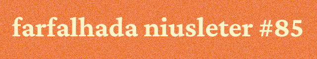 A farfalhada niusleter é o meio mais livre e satisfatório por onde espalho, na internet, meus escritos fragmentários de muitos temas e tons: dos arranhões filosóficos e políticos baseados, quase sempre, no debate sobre civilização e ecologia, aos meus haicais, haibuns e zuihitsus da vida cotidiana. Alguns dos textos que compartilho aqui estão presentes no meu último livro, um miscelânea fragmentária chamada Retalhos. Atrair inscritos é sempre uma alegria, mas dá trabalho. Se você acompanha e aprecia esta niusleter, e conhece gente que também faria o mesmo, compartilhe, indique.
