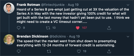 Naturally after seeing this, a bunch of us were trying to figure out which company Frank was talking about. We figured that with a few facts like: Series A to Series B, May to August, and 3x valuation...we’d be able to figure it out. Crazy thing is, it’s actually essentially impossible to come up with just one name since you’ll get a couple of different answers that fit the description depending on who you ask.