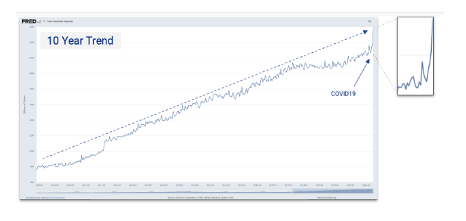 Another argument was that, similar to the 2008 crisis, people are going to want to move more assets to cash in general and keep it on hand due to uncertainty. The 10 year chart from the Fed of checkable deposits, which tracks checking account volume, demonstrates that fact. The big spike at the end involves stimulus checks, extra payments in unemployment checks, perhaps severance payments if folks were laid off, and people trying to keep more money liquid. In a CNBC interview last week, Bank of America CEO Brian Moynihan said checking accounts have 30% to 40% more money in them compared with 12 weeks ago.