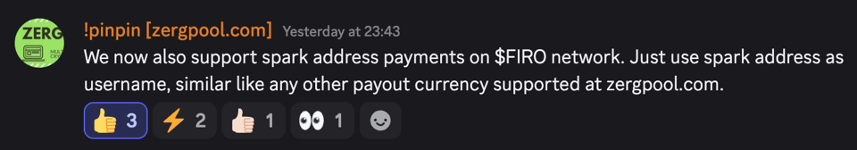 ZergPool a Firo mining pool has enabled the ability to receive payouts to Spark addresses for added privacy! Just enter your Spark address instead of a transparent Firo address.