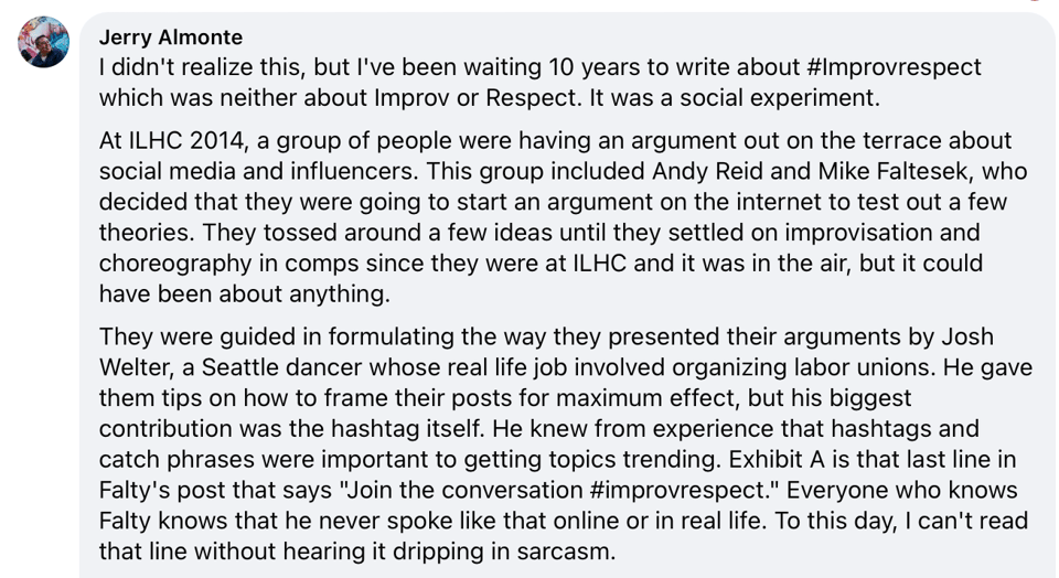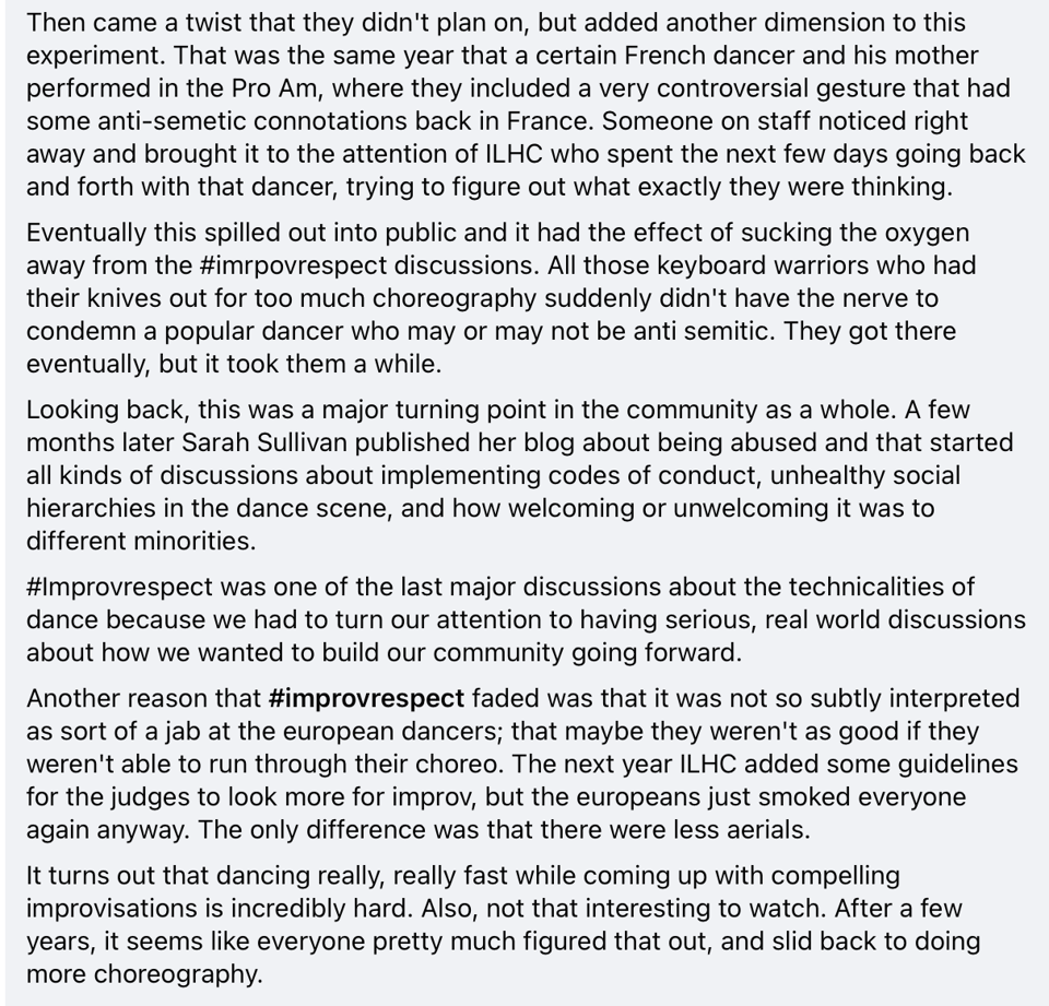 Where I split off from Jerry is that I don’t think the origin of #ImprovRespect really changes the effect it had on me and a surprising number of people I know. Since my piece went live, many people who started dancing within a couple years of me messaged about the effect this had on the way they watched contests, and even the way they think about preparing themselves for contests. I stand by my assessments of the similarities and differences in the scene’s contest priorities now.