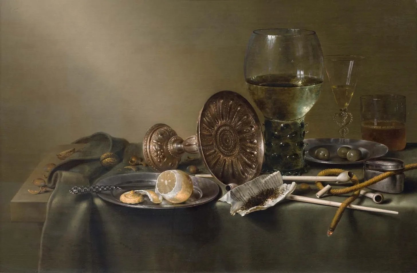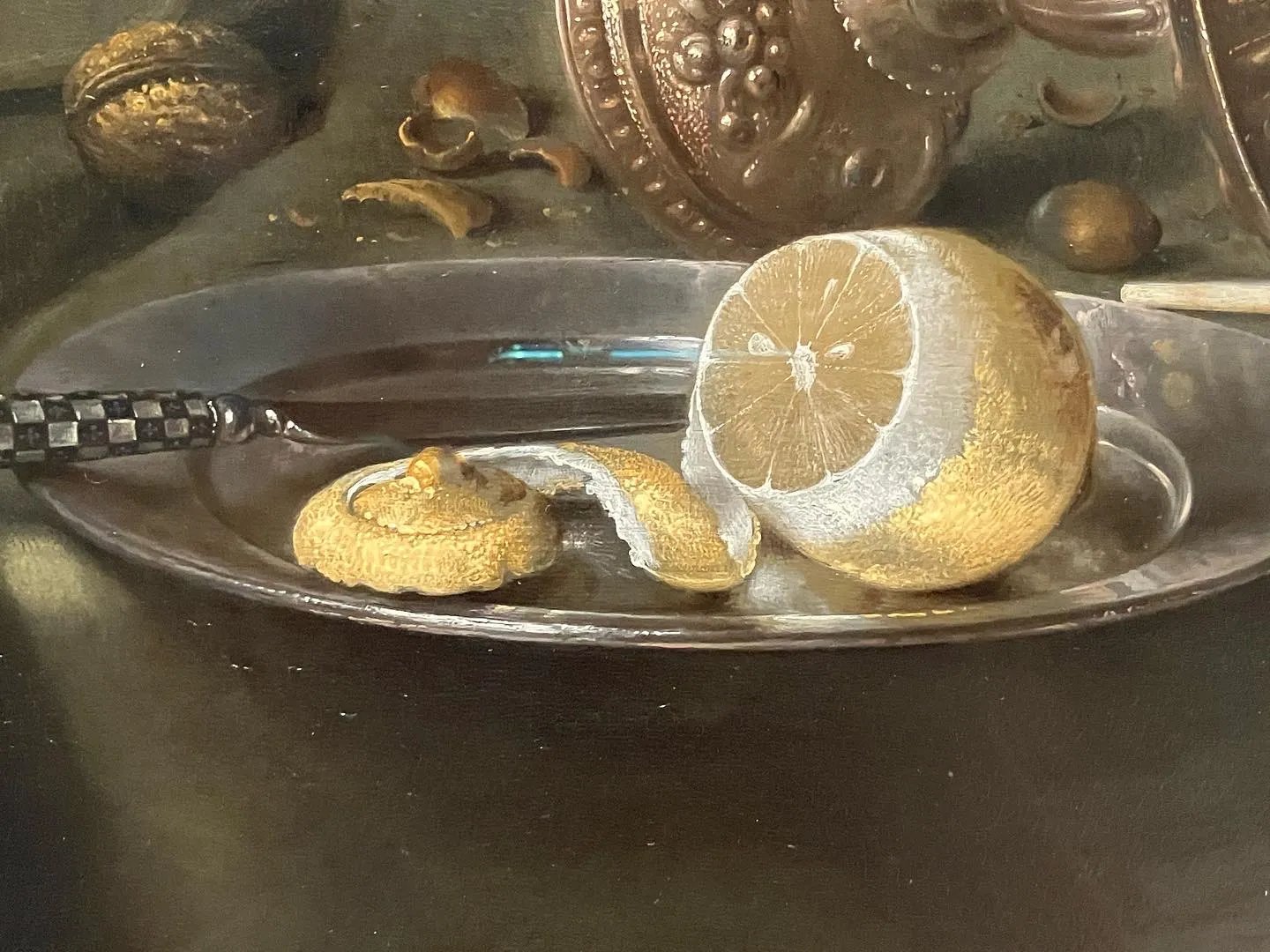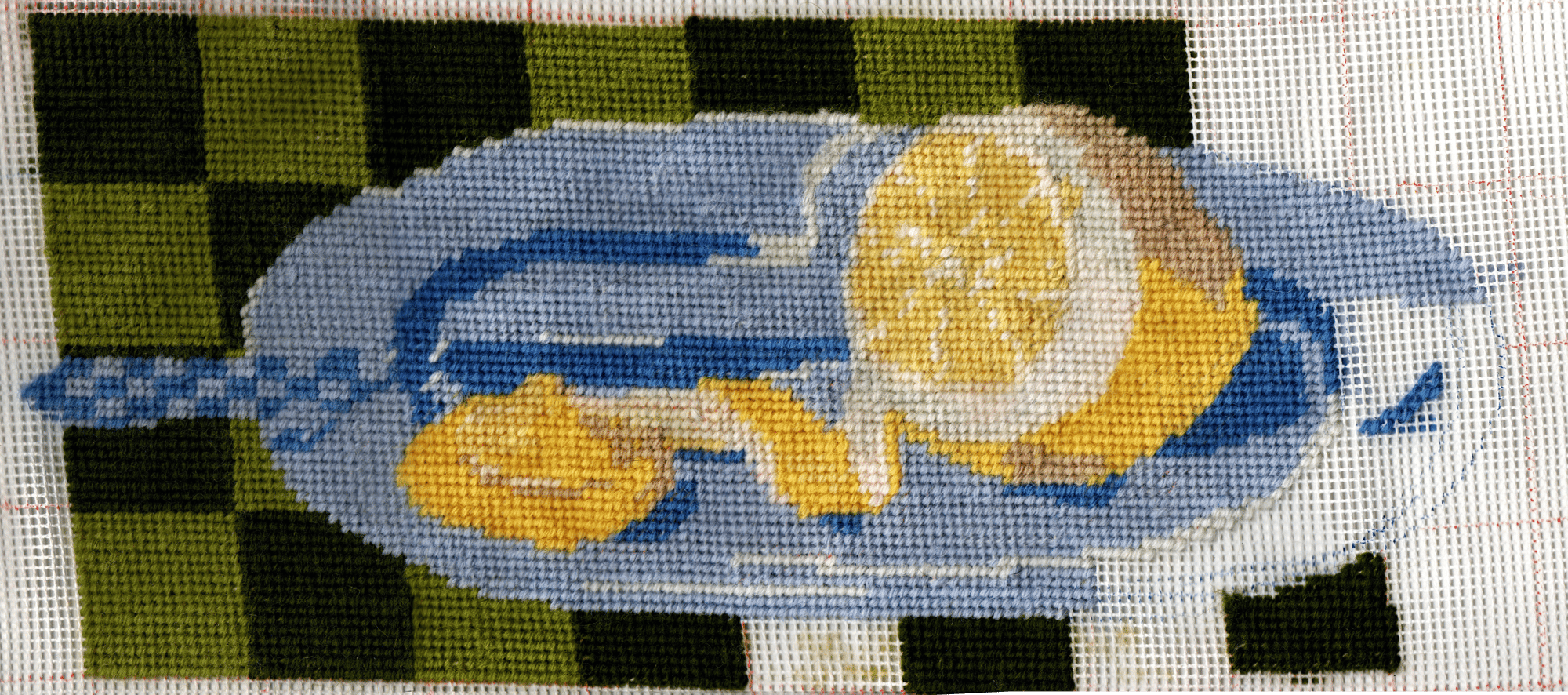 Kaffe Fassett’s Glorious Inspirations helped me learn how to create needlepoint designs from references from art history. The image reference was taken from a detail from a Dutch still-life by Willem Claez. Heda, Still Life with Glasses and Tobacco, that I saw in 2022 at the Boston MFA: