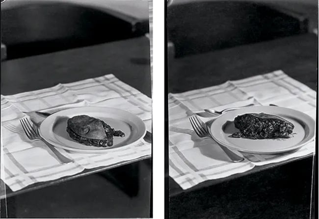 Against his inclination, Man [Ray] encouraged Lee [Miller] to find her own path. He sent her to work for firms that wanted a Man Ray but would accept the work of Madame. Among the most bizarre assignments he gave her was the stint as a photographer at the Sorbonne medical school, a job that appealed to her love of the macabre. One day Lee walked from the Left Bank operating theatre to Frogue [French Vogue] headquarters carrying a breast on a dinner plate, covered by a cloth. Having retrieved it from a mastectomy with the intention of taking a picture, she placed a knife and fork on either side, then added salt and pepper shakers to this morbid still life, a true nature morte.
