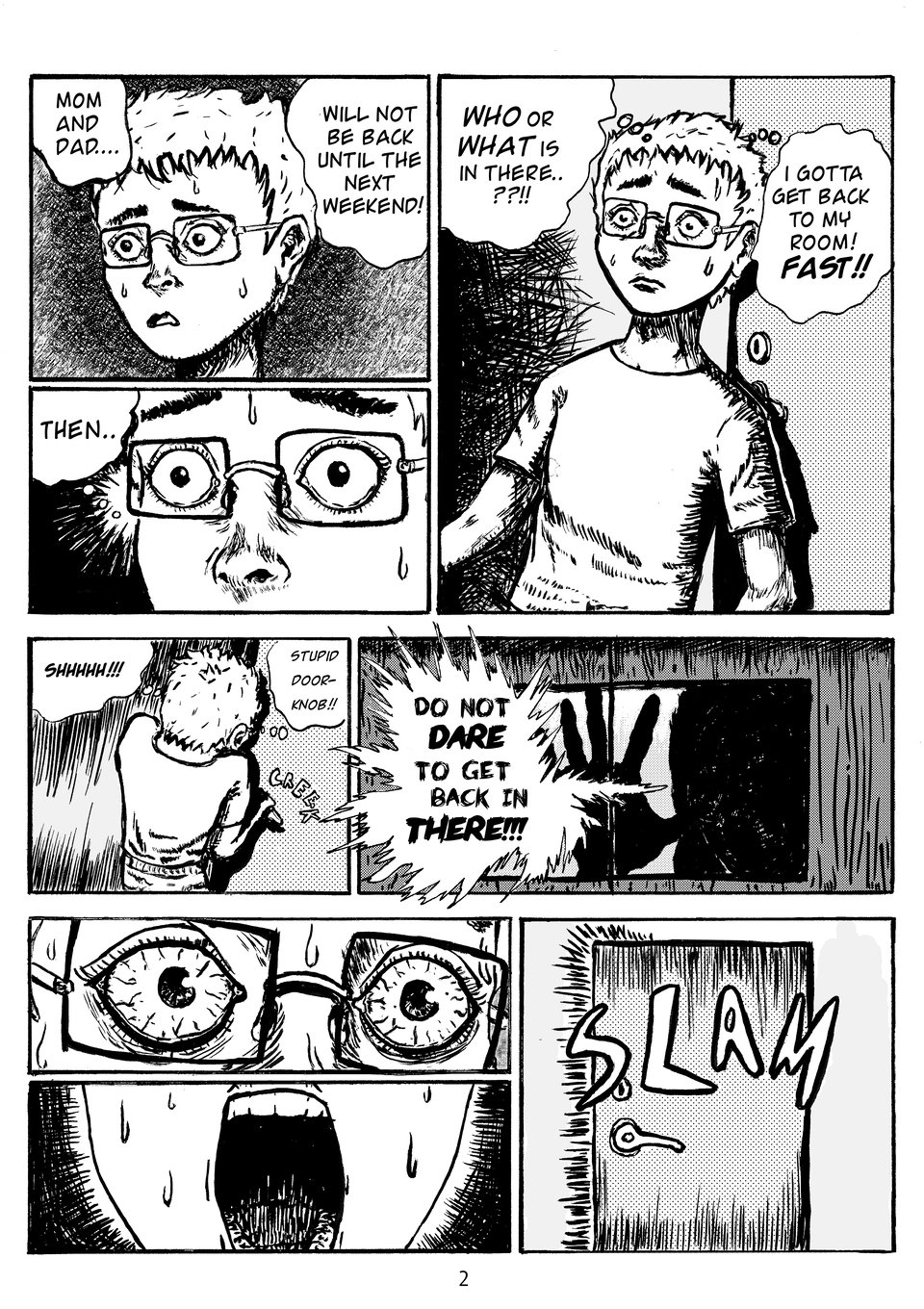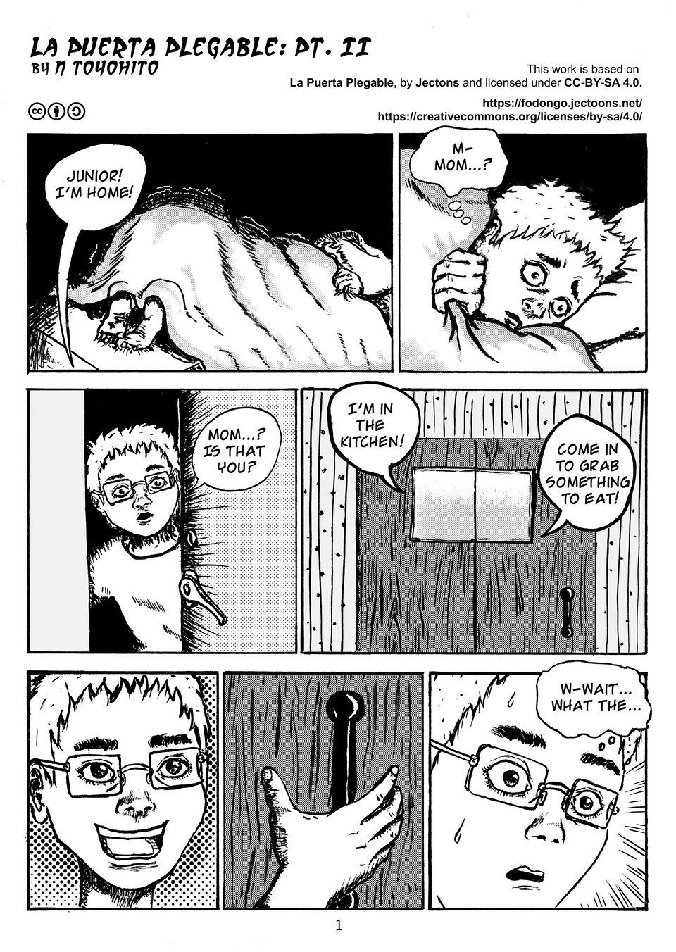 For his derivative work, he chose to make a sequel to my comic from Issue #4, "La Puerta Plegable, un susto". He cranked up the horror to 11 and somehow managed to draw a likeness of myself when I was a teenager without ever laying eyes on me, which is odd but works out!