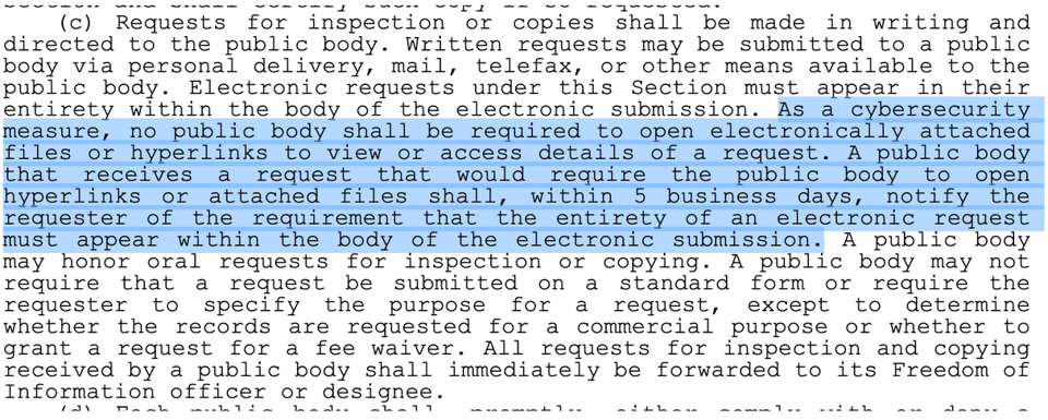 When I send FOIA requests, unless I’m forced into a portal, I typically write up the request in a PDF, then attach it to an email. It’s just the method and process I’ve followed for a while! But this is the first time I’ve encountered clause and subclause 3c, which says, and I kid you not:
