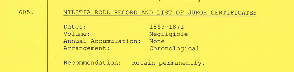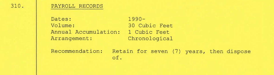 Then we get into the meat and potatoes. Each document type is broken out with a description, the dates of the collection, the size (which determines physical space, boxes, shelf space, etc in the archive, unless digitized) and the way records are kept. There’s also a recommendation for the minimum amount of time that each record type is or should be kept, something that I believe can only be modified by filing a new schedule with the archives.