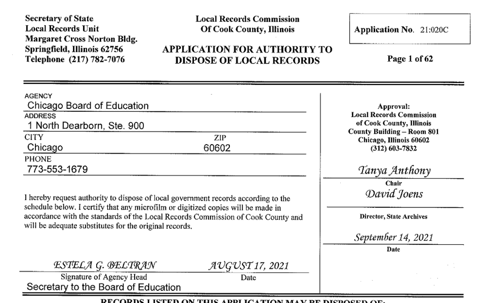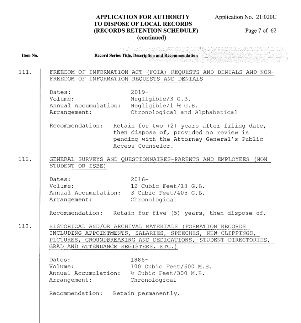 In this case, the Chicago Board of Education keeps FOIA requests and denials (like a FOIA log) for two years after the date of filing per the schedule. That doesn’t mean that records before that time are automatically pulverized, but it’s just the minimum suggested amount of time for that record type. (It probably means that the request I filed for this almost four or five years ago is no longer!)