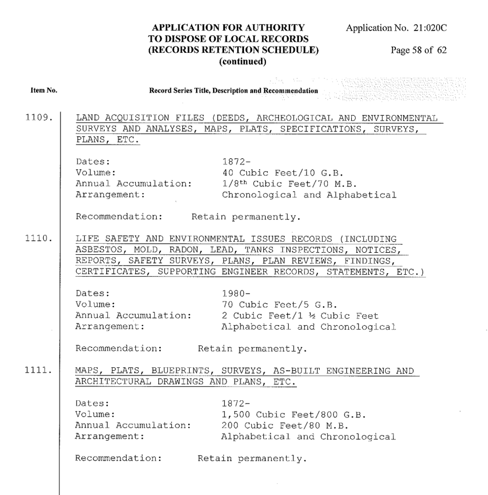 Records retention records aren’t just great for FOIA requests, but archival research. If you ever find yourself in your state or local archive, they can be invaluable for research, in part because they’re designed for that. You might be able to dig up details about structures, people, departments, systems or programs that don’t exist anymore — these facility and land acquisition records, for example, go back to just a year after the Chicago Fire of 1871 (!):