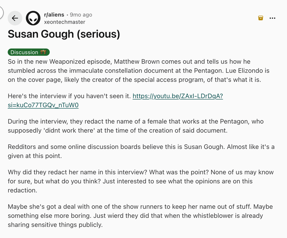 A quick aside, though, because of course — people think that Sue Gough is an alien? Or knows something about it? Which feels insane but it is literally one of the first things that pop up when I search her name: