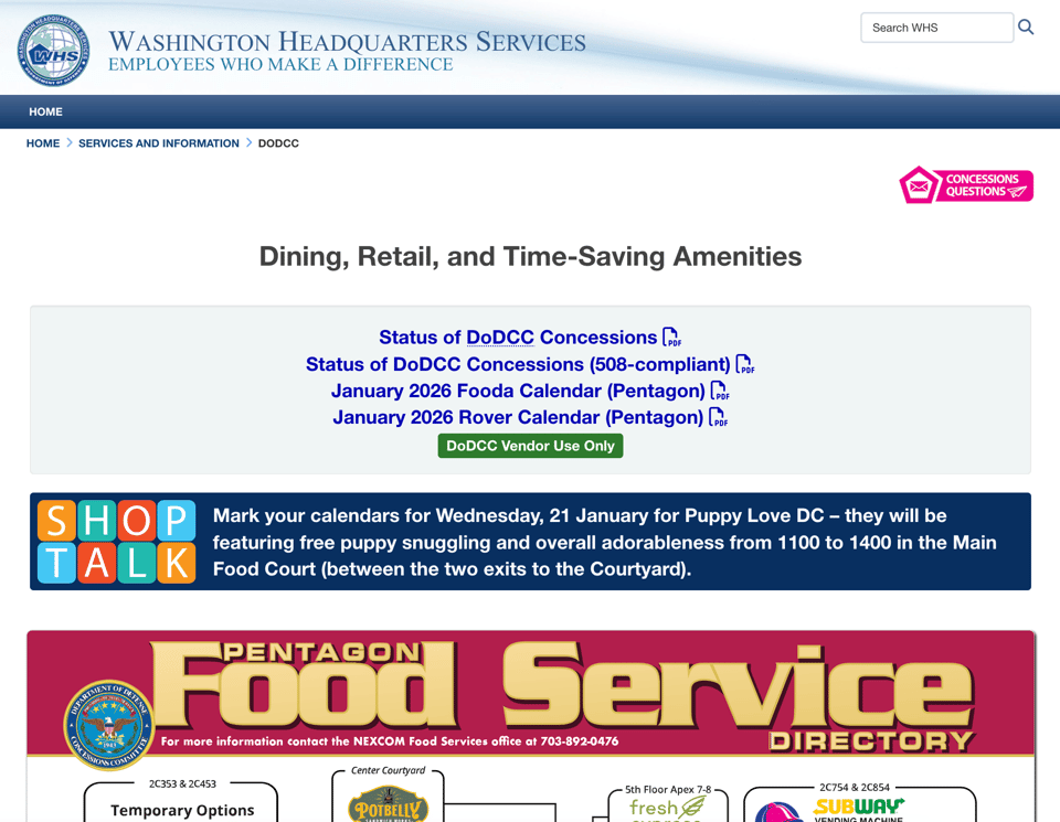 I started to think that maybe it was the DoD Defense Commissary Agency, that doesn’t quite fit with their mission. But then! Nestled on the Washington Headquarters Services website, a landing page for menus, concessions, events and maps of the food court and other amenities.