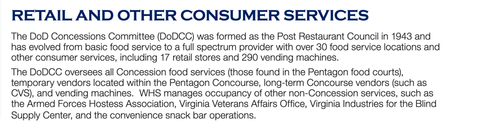 A big 2025 “WELCOME to the PENTAGON” pdf also has descriptions about the different third-party vendors within the food court specifically, and the DoDCC oversees all of them.