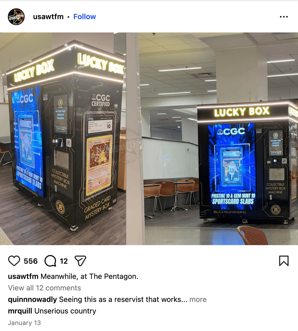 As originally reported by Task & Purpose, the “lucky box” appeared in the main Pentagon food court, and offers those who pony up cash to possibly win a blind loot box that, in the past, has netted winners “a boxing glove autographed by legendary fighter Muhammad Ali, and a 2003 Topps Chrome Lebron James Rookie Gem Mint 10 card.” (Not to mention rare Pokémon cards, a possibility which 404 Media reported.)