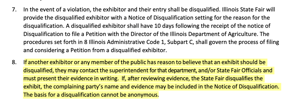 - Documents related to the state fair's butter cow, including materials used, purchase orders, standard operating procedures or other memos. If needed to keep the request from being unduly burdensome, please limit the search for records between 2020 and 2026. If possible, please release documents in a .pdf or digital format. - Contracts, riders, addenda, permits, or MOUs between the Illinois State Fair and musical performers between 2023 and 2026. These documents may include technical specs about the performance and set, may include requirements for staff or musicians, and also may include details about the compensation received by musicians. Please release documents in a .pdf or digitized format if possible. - Copies of disqualification notices issued by the Illinois State Fair between 1/1/2024 and 2/4/2026, including any related petitions filed to protest the Notice of Disqualification as described in 8 Illinois Administrative Code 1 Subpart C. Please also include any evidence provided by external parties that may have contributed to the Notice of Disqualification, as described in this policy (https://statefair.illinois.gov/content/dam/soi/en/web/statefair/competitions/premium-books/general-book/2025%202%20General%20Show%20Rules%20and%20Regulations.pdf).