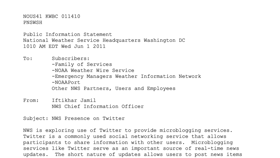 It also was the date of a massively important, underrated relationship: one between the National Weather Service and Twitter.