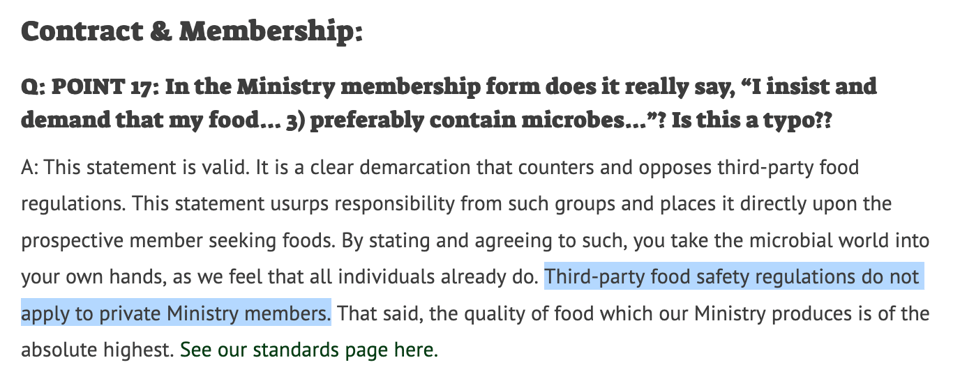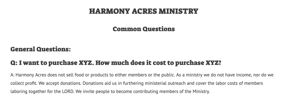 In the case of Harmony Acres, for example, they’re a private membership club that does not sell anything, don’t you dare say they sell anything, but instead offers milk in exchange for donations to the ministry.