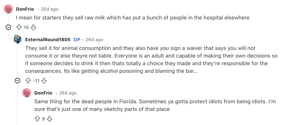 Let’s get back to buyers and sellers. In Chicago, “getrawmilk.com” only offers up delivery programs for residents. But we know, based on this very official Reddit post, that stores do, in fact, sell raw milk that they reasonably anticipate people (not pets) will drink.