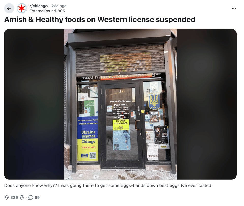 Last month, there was uproar — devastation! — on r/Chicago, as a resident posted some shocking news: Amish & Healthy Foods, a corner store, had its license suspended.