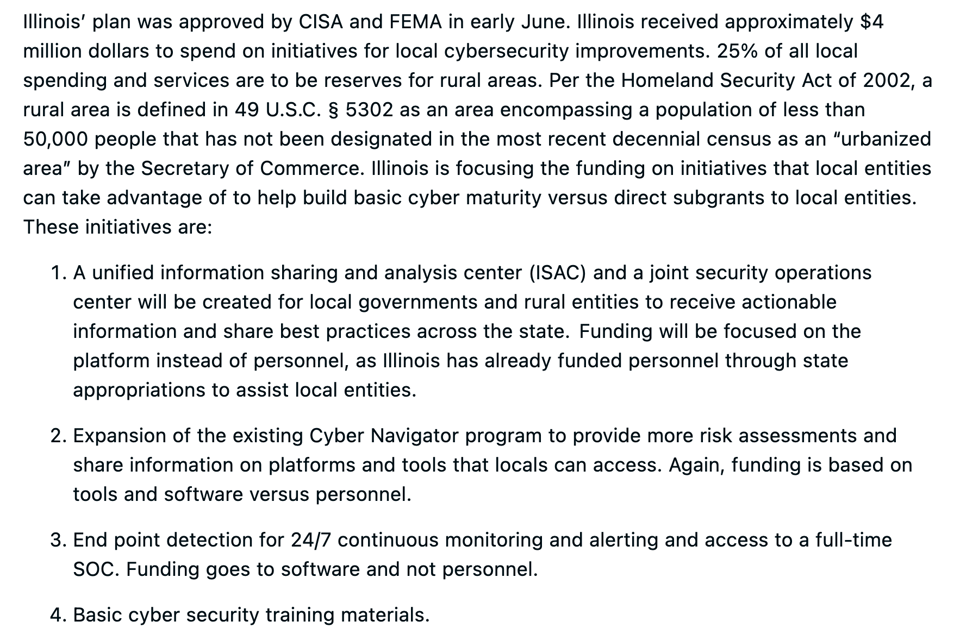 Federally, something that comes into play is funding from the State Local Cybersecurity Grant Program, which is backed by CISA and FEMA. There are a few things that Illinois is trying to apply the funding toward, including beefing up that training program, as well as providing endpoint monitoring (especially for school districts) and a Cyber Navigator program that gives each region of the state a point person within DoIT for assistance with cybersecurity questions. Honestly, pretty cool!