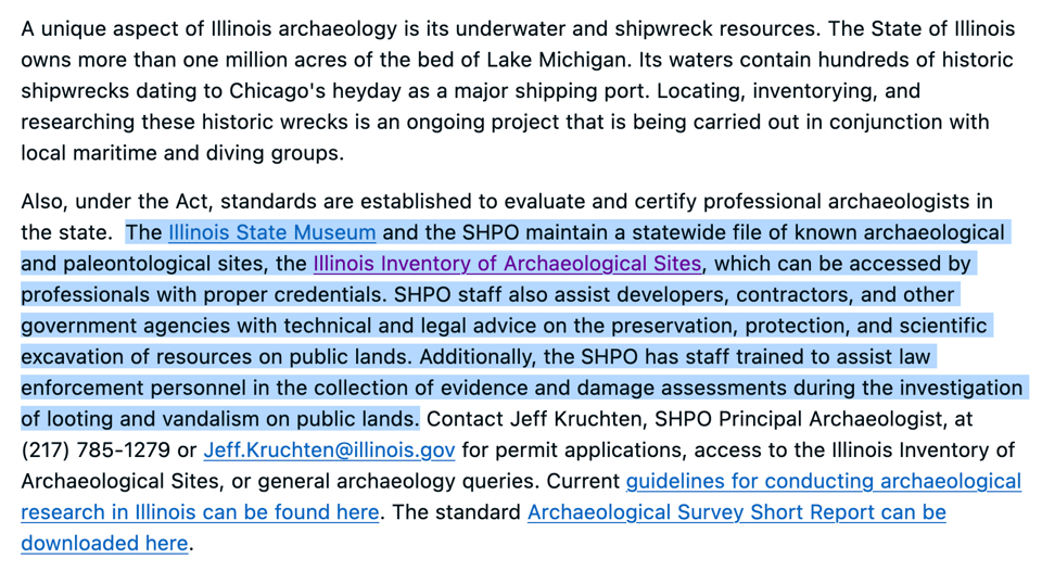 - A copy of the Illinois Inventory of Archaeological Sites (https://maps.dnr.illinois.gov/portal/apps/webappviewer/index.html?id=91ce4b91ea9c4c2687fa37098b0c26d9), including the name of the site and any related data fields. Please release data in a .xlsx, .csv, .geojson, .sqlite or other machine-readable file, if possible. If there are concerns akin to that of NPS under the federal APRA (https://www.nps.gov/subjects/archeology/archaeological-resources-protection-act.htm), I am okay if you only release sites that may fall under a "Class I" or "Class II" designation, or sites that are not at imminent risk of looting or damage due to public disclosure. I'm happy to talk more about this request over the phone or via email; I'm also happy to receive access to inspect the records, instead of a copy of the records themselves.