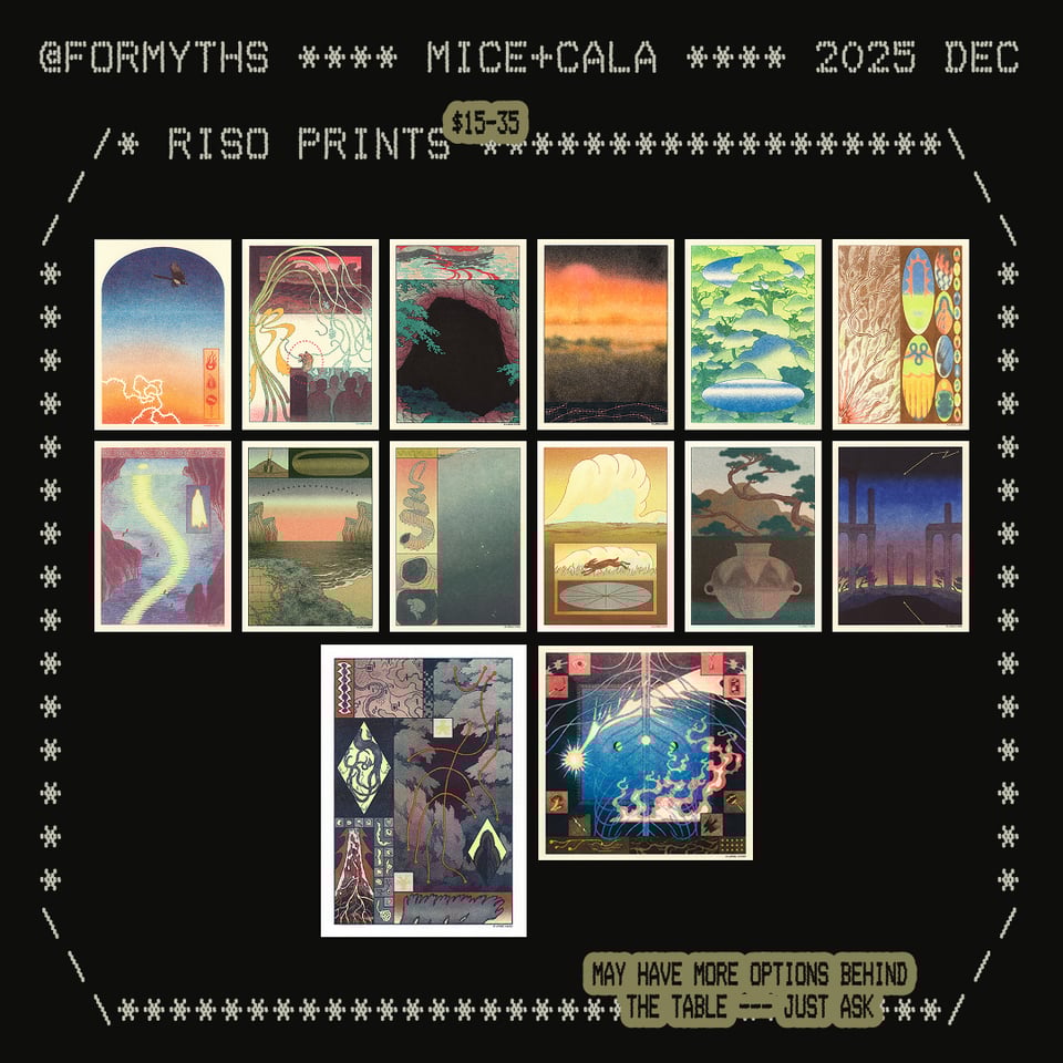I’ll also have a curated selection of riso prints (not 100% finalized yet) - I don’t really fully unpack tabling stock though so I may have more options behind the table, just ask.