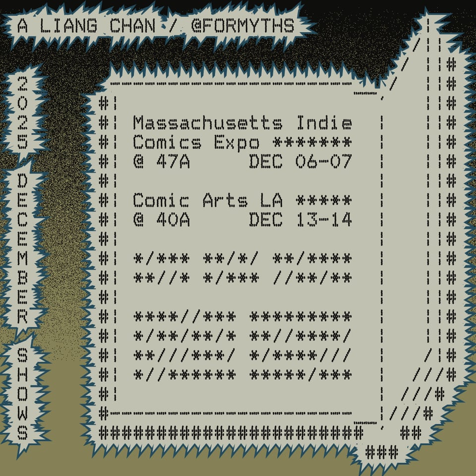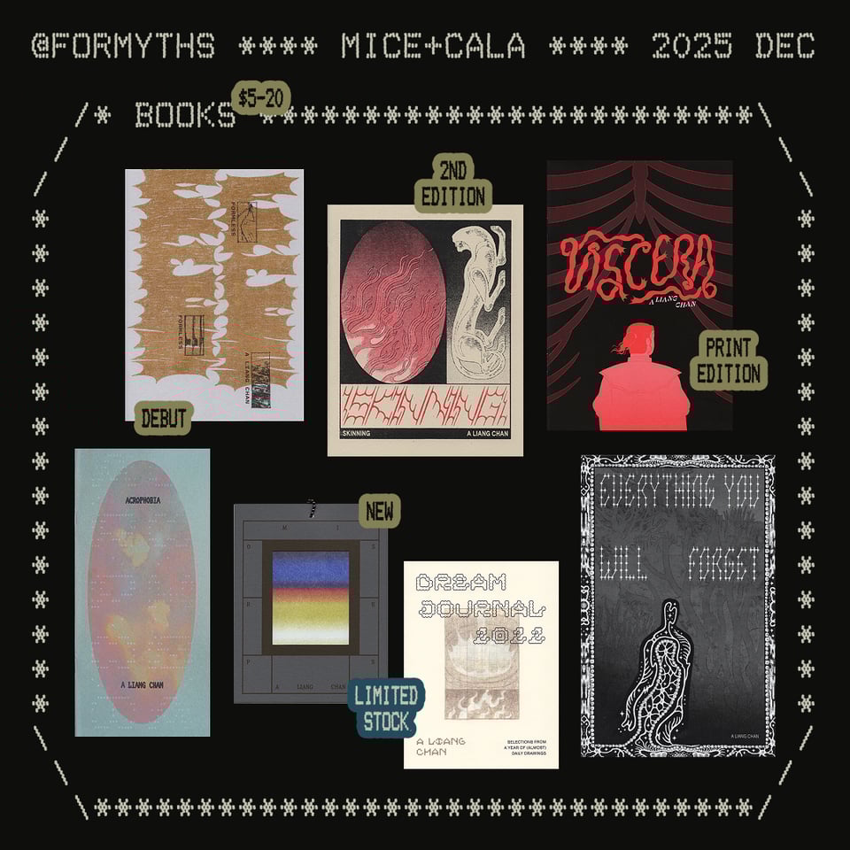 I’ll have: debut copies of Formless Formless, 2nd edition copies of Skinning, print editions of my 2021 comic Viscera, + the other 2 new not technically comics books I made this year…